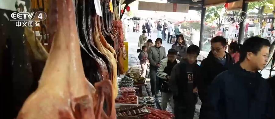 总台记者 李若冰:乘着画舫船沿河而行,空气中弥漫着浓郁的腊香味。您看,这屋檐下的腊肠、酱鸭等腊味,就是安昌人心中最地道的年味。