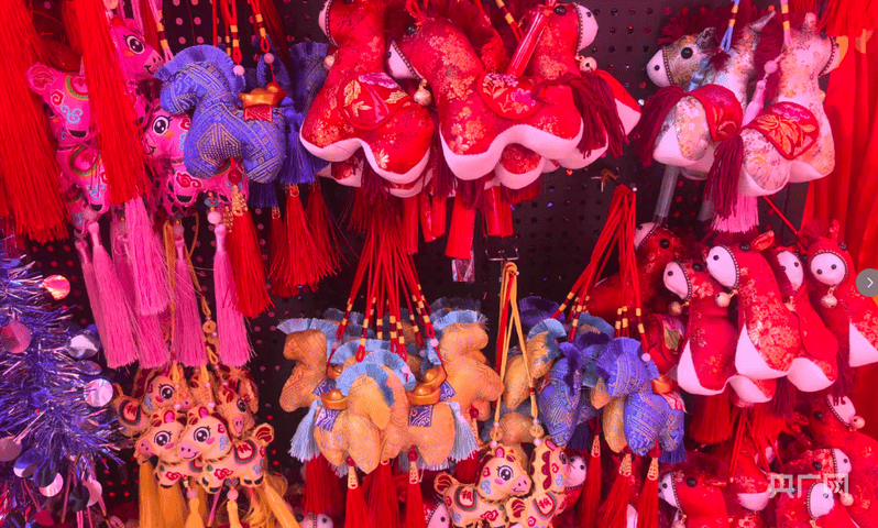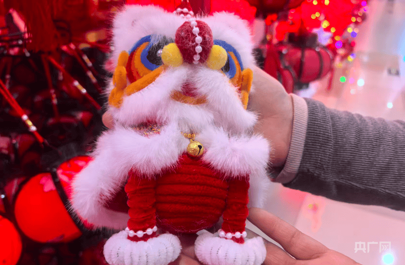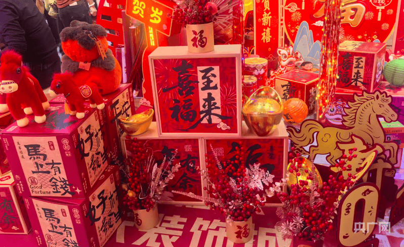 记者看到, 手工竹编的小熊灯、憨态可掬的醒狮布偶、玲珑剔透的莲花提灯,以及灵动鲜活的金鱼挂件,超萌可爱马主题卡通布艺挂件,马年组合饰品摆件,每一个都让人爱不释手。在一张张“福”字挂件上,红绒布与金银线交织出“马上有福”“马到成功”“龙马精神”的字样,将马年的祝福融入到迎新春的年货中。